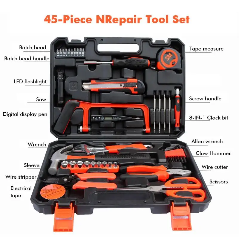 ORIGINAL 45 pcs Garage and Home Tool Kit with Claw Hammer Wrench Pliers Screw Bits Tool Set in Box For Home